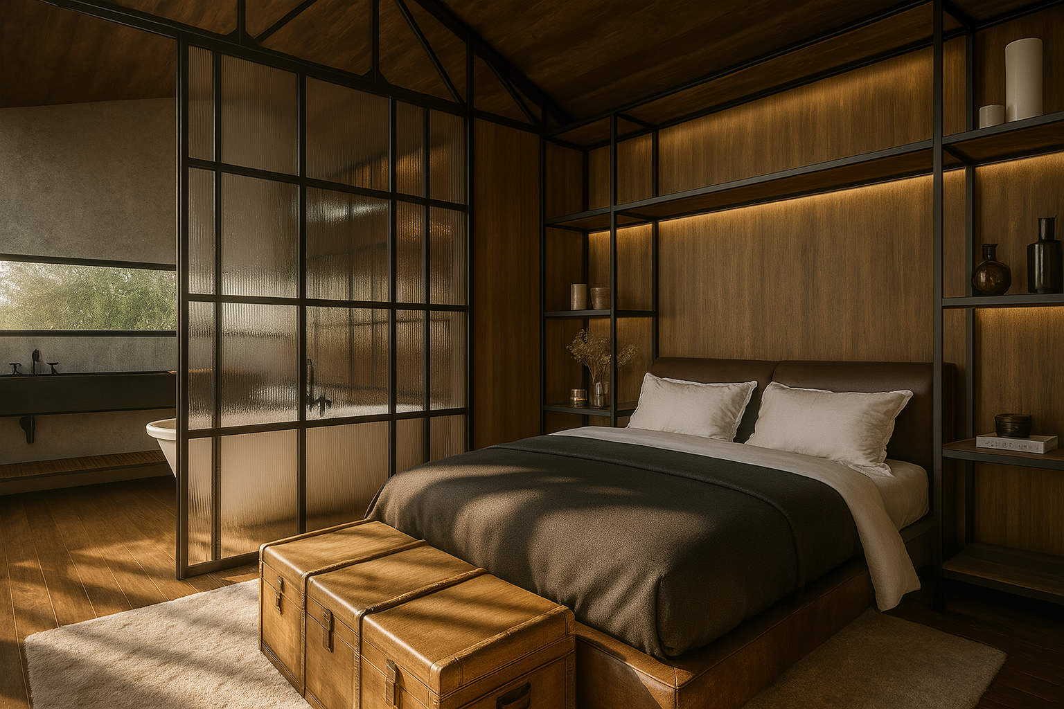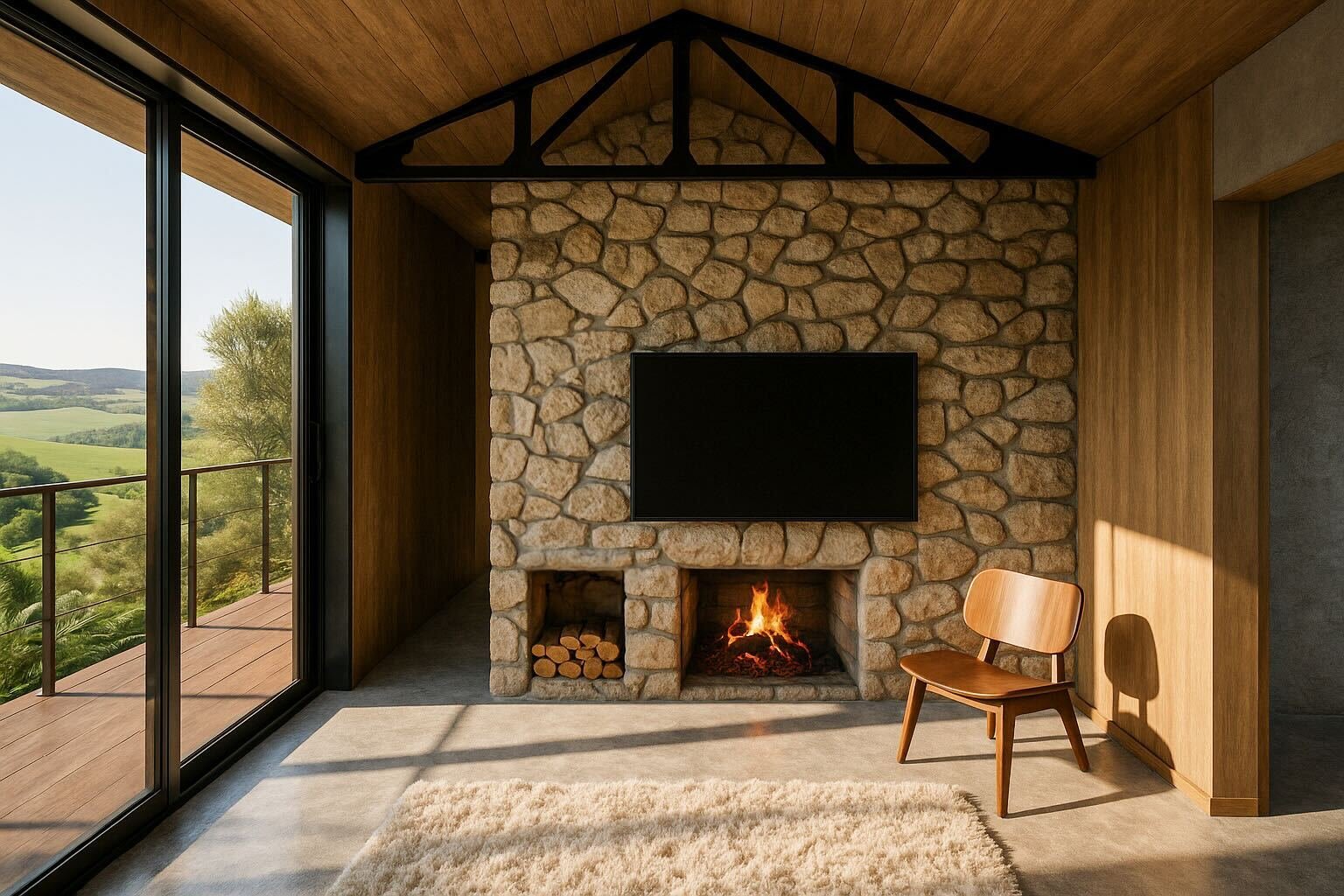 A arquitetura valoriza a integração com o entorno. Pedra rústica e madeira natural estruturam os interiores, criando uma ambiência que dialoga com a paisagem e reforça o pertencimento ao lugar. Esses materiais, carregados de textura e ancestralidade, são equilibrados por elementos contemporâneos como estruturas metálicas em preto fosco e painéis de vidro canelado, um contraste intencional que confere elegância e sofisticação sem romper com o espírito local.