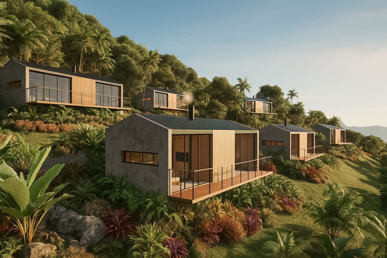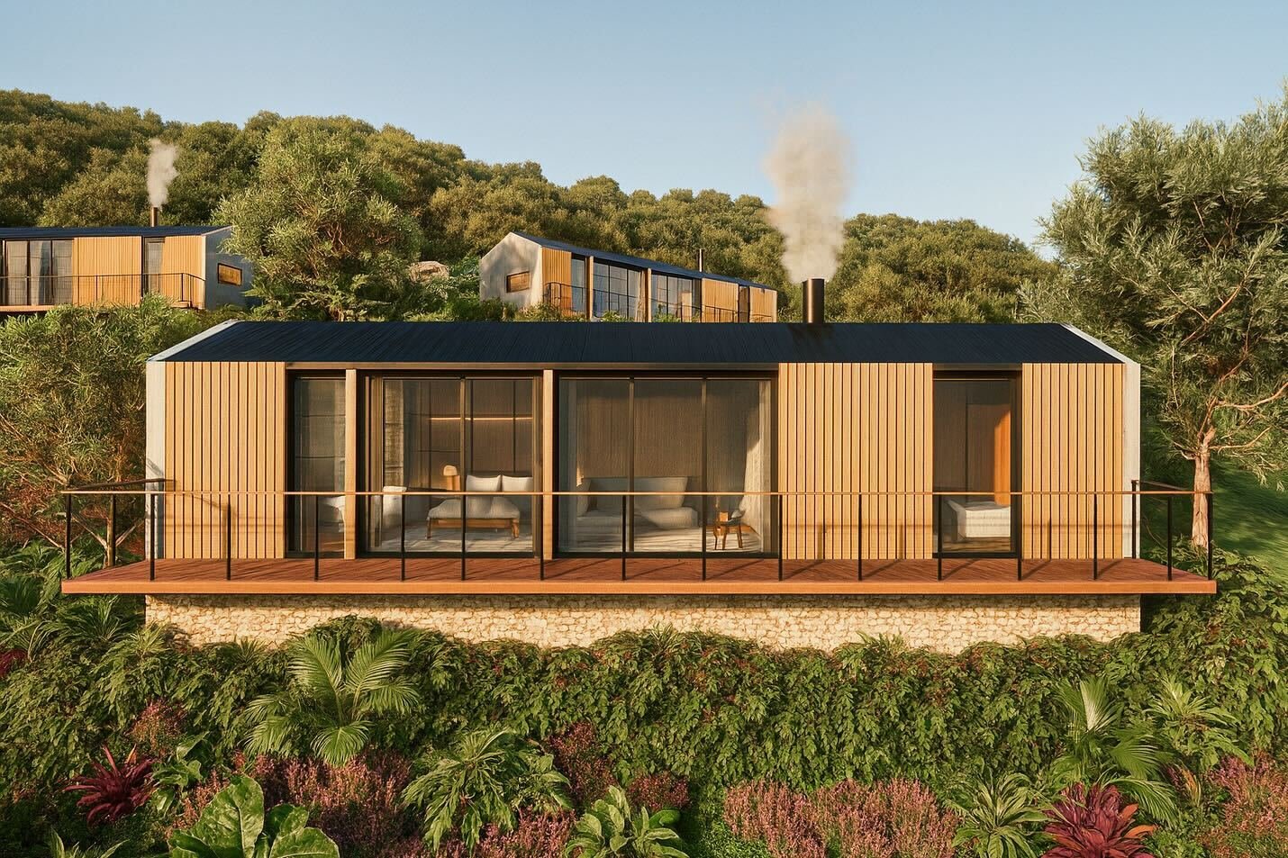 Assim surgiu o desenho de um conjunto de chalés distribuídos na parte mais alta do terreno, com vistas privilegiadas para as montanhas. Foram desenvolvidas duas tipologias: uma com dois dormitórios, voltada para famílias, e outra mais compacta, com um dormitório, ideal para casais ou visitantes em busca de sossego.